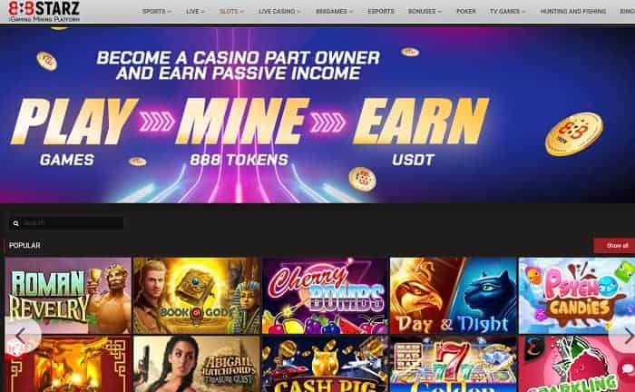 Welcome to the 888STARZ review! The most important thing to know about 888STARZ online casino is that this resource is not an ordinary casino where you can only win or lose a certain amount of money, but an investment gambling project that has no analogues in the world. 888STARZ Casino, operating since 2020, is a gaming mining platform that offers players a dividend model based on blockchain technology. In fact, by performing certain actions on the casino website, you get yourself units of the real cryptocurrency (888Tron tokens, or just 888).