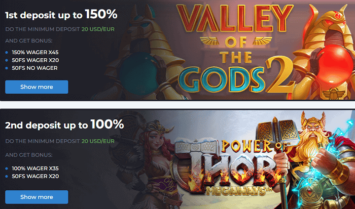 - First Deposit: Players can enjoy a 150% bonus up to €500, along with 50 free spins on Reactoonz 2 by Play'n GO and 50 free spins on Valley Of The Gods 2 by Yggdrasil.