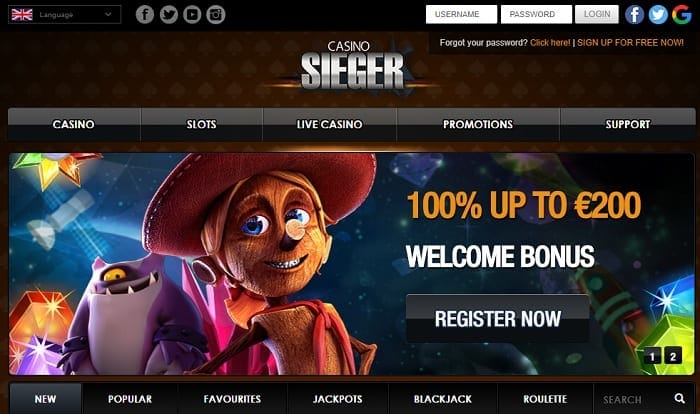 Register at Casino Sieger and collect a 150% welcome bonus up to 300 EUR. In addition, grab up to 20 free spins as a no deposit bonus after registration!