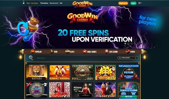 Register at GoodWin Casino and play 2000+ games from best gaming studios. Also, get 20 free spins after successful registration and account verification. Enjoy quick payouts, round-the-clock customer service and mobile-friendly website. Try your luck on slot machines, video poker, scratch cards or Live Dealer. No download needed! Instant play and win, 24/7!
