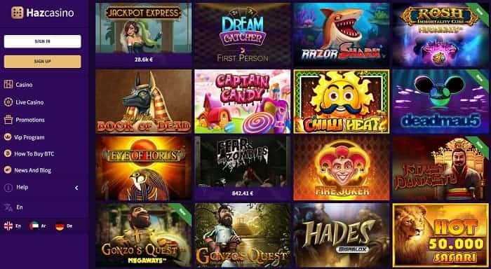 When entering Haz Casino you will immediately be greeted by bright and exciting graphics on a soothing purple backdrop. The layout is calming and enticing at the same time, and the lobby offers an excellent entry point to the rest of the platform. In the lobby one can find a scrolling list of the top games and latest additions, the most recent winners as well as top winners, a sneak peek into the promotions currently available as well as what’s new on the platform.