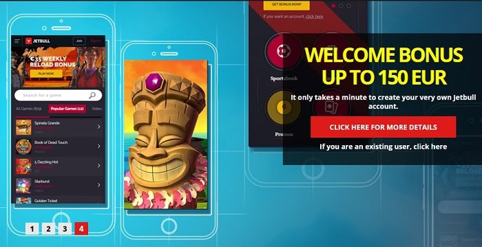 New to Jetbull Casino? Lucky you! Open your account for free and get a 100% up to $/€/£150 bonus combined with 200 mobile free spins on slot machines. No download needed!