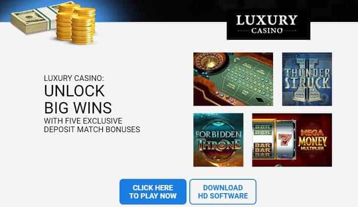 Registering a new account at Luxury Casino is quick, as the home page navigation is extremely user-friendly. Simply click on the ‘Play Now’ button to complete a few important details, and you’ll be supplied with your unique account number in no time, ready to start playing. While the casino doesn’t offer bingo or sports betting, it has a mobile-friendly version and more than 600 different casino games to enjoy, including slots, table games, video poker, and scratch cards. But before we start playing, let’s take a look at all the enticing offers you can look forward to at Luxury Casino.