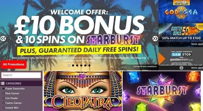 First Deposit Bonus - get 100% match up to £10 and 10 free spins on Starburst. Deposit £10 or more to qualify for this nice welcome offer. No bonus codes needed. General T&C apply.