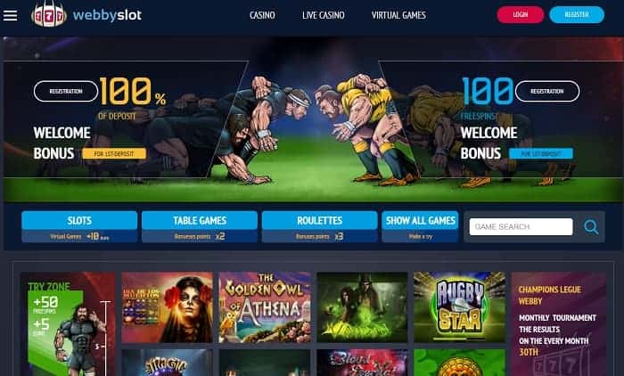 Welcome to Webbyslot Casino, Live Dealer and Virtual Games. This is the first rugby-themed online casino with slot machines, free spins, fast cashouts, and instant support. Powered by the best gaming software (Netent, Microgaming, Play n'Go, etc), the casino offers high-quality gaming entertainment for both, desktop and mobile customers. Read our Webby Slot Casino review and claim exclusive bonuses on registration. Happy gaming!