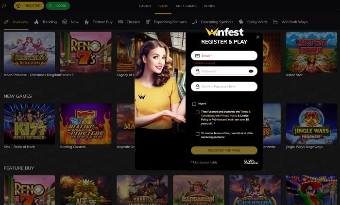 Sign up at Winfest Casino and play to win real money. Claim our exclusive offer on your first deposit and get extra money and free spins. The casino lobby offers a very nice game section with popular slot machines, progressive jackpots, and live dealer games. Enjoy instant support and quick cashouts via e-wallets, credit/debit cards, and online banking. Read our Winfest review and learn more about this fantastic casino online and mobile.
